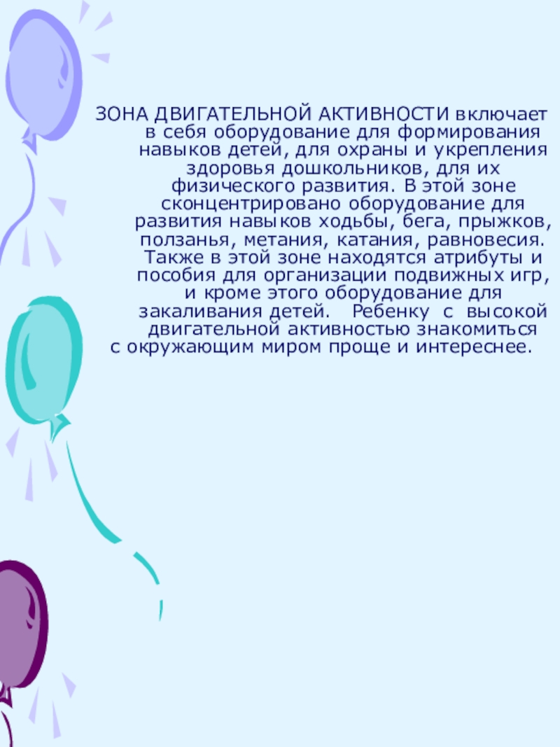 для охраны и укрепления здоровья дошкольников, для их физического развития. В этой зоне сконцентрировано оборудование для развития навыков ходьбы, бега, прыжков, ползанья, метания, катания, равновесия. Также в этой зоне находятся атрибуты и пособия для организации подвижных игр, и кроме этого оборудование для закаливания детей. Ребенку с высокой двигательной активностью знакомиться