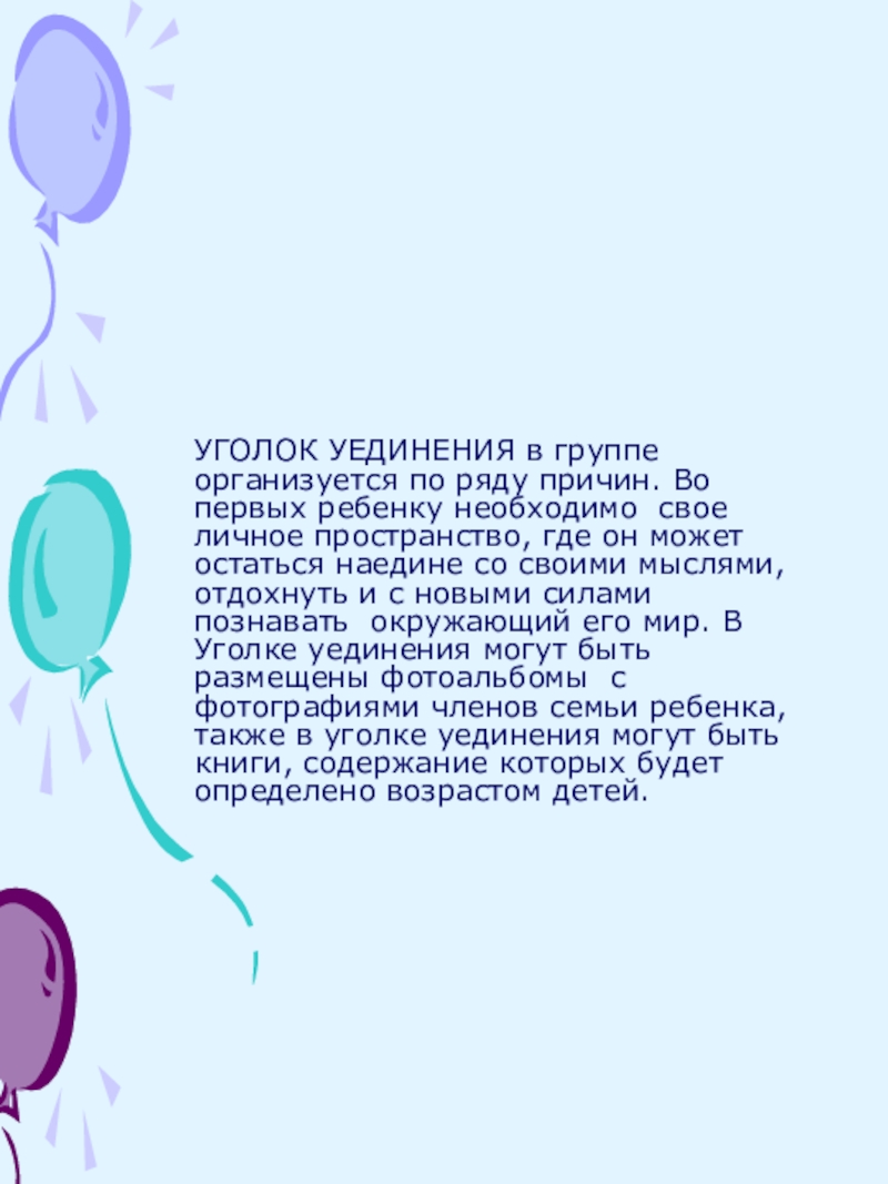 Слайд 8УГОЛОК УЕДИНЕНИЯ в группе организуется по ряду причин. Во первых ребенку