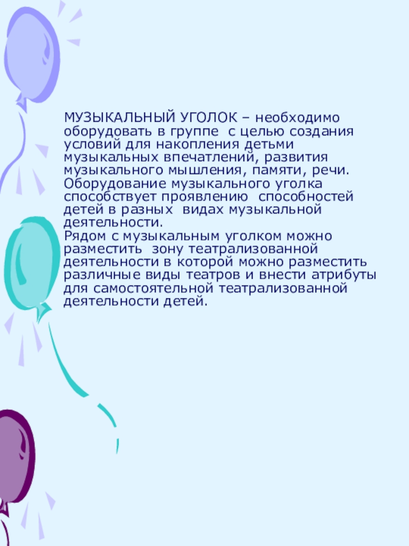 Слайд 6МУЗЫКАЛЬНЫЙ УГОЛОК – необходимо оборудовать в группе с целью создания условий