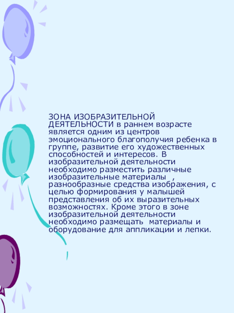 благополучия ребенка в группе, развитие его художественных способностей и интересов. В изобразительной деятельности необходимо разместить различные изобразительные материалы , разнообразные средства изображения, с целью формирования у малышей представления об их выразительных возможностях. Кроме этого в зоне изобразительной деятельности необходимо размещать материалы и оборудование для аппликации и лепки.