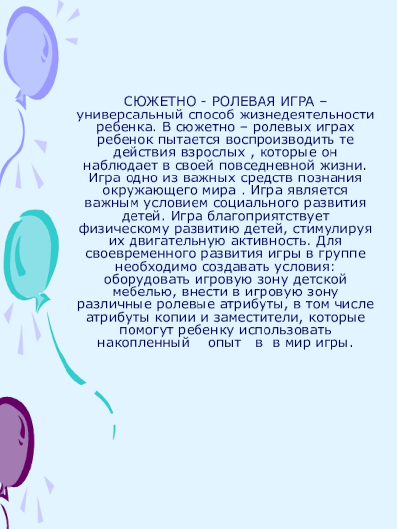 Слайд 3СЮЖЕТНО - РОЛЕВАЯ ИГРА – универсальный способ жизнедеятельности ребенка. В сюжетно