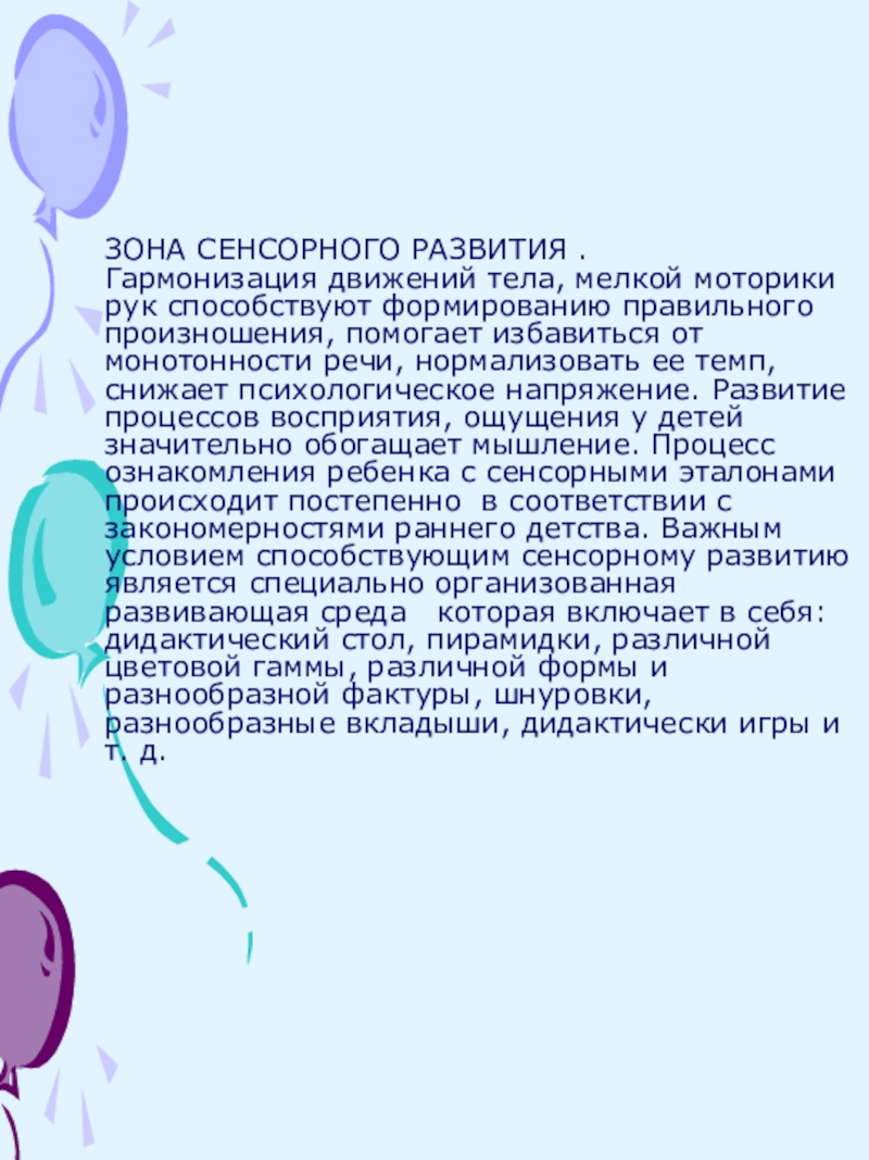 Слайд 4ЗОНА СЕНСОРНОГО РАЗВИТИЯ .
