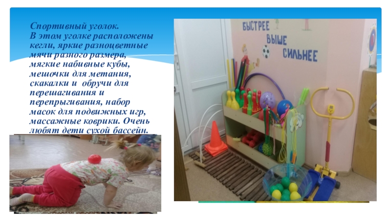 В этом уголке расположены кегли, яркие разноцветные мячи разного размера, мягкие набивные кубы, мешочки для метания, скакалки и обручи для перешагивания и перепрыгивания, набор масок для подвижных игр, массажные коврики. Очень любят дети сухой бассейн.