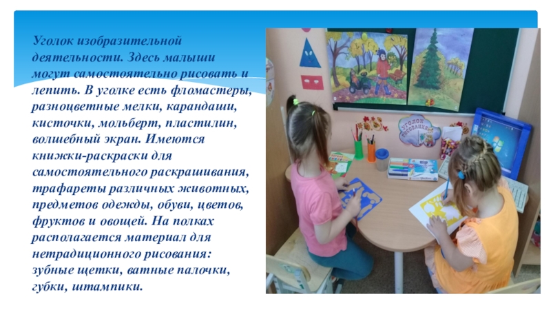 Слайд 15Уголок изобразительной деятельности. Здесь малыши могут самостоятельно рисовать и лепить. В