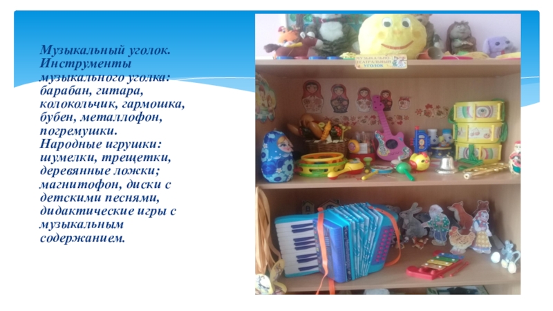 Слайд 20Музыкальный уголок. Инструменты музыкального
