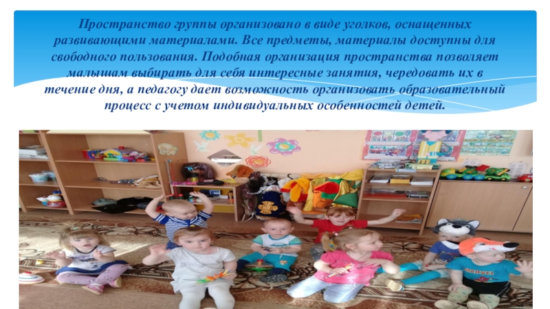 Слайд 3Пространство группы организовано в виде уголков, оснащенных развивающими материалами. Все предметы,