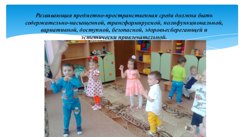 Слайд 2Развивающая предметно-пространственная среда должна быть содержательно-насыщенной, трансформируемой, полифункциональной, вариативной, доступной, безопасной,