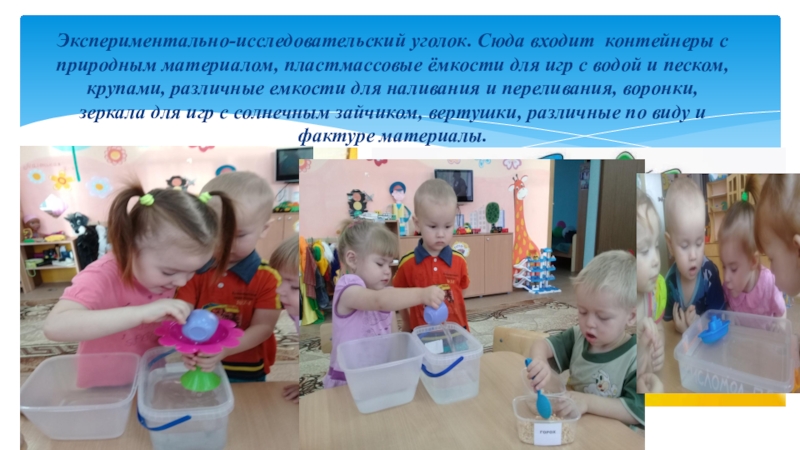 Слайд 14Экспериментально-исследовательский уголок. Сюда входит контейнеры с природным материалом, пластмассовые ёмкости для