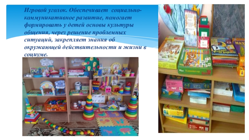 Слайд 5Игровой уголок. Обеспечивает социально-коммуникативное развитие, помогает формировать у детей основы культуры общения,