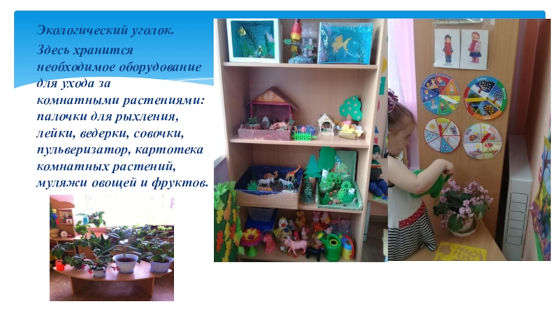 рыхления, лейки, ведерки, совочки, пульверизатор, картотека комнатных растений, муляжи овощей и фруктов.