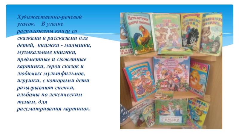 Слайд 16Художественно-речевой уголок. В уголке расположены книги со сказками и рассказами