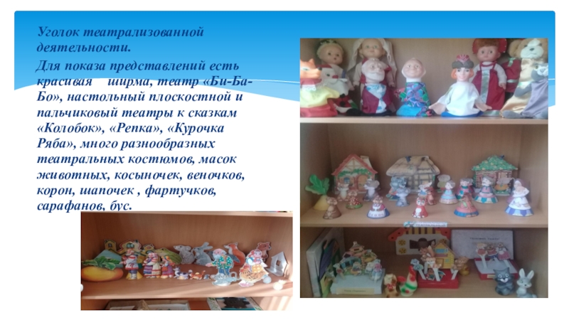 настольный плоскостной и пальчиковый театры к сказкам «Колобок», «Репка», «Курочка Ряба», много разнообразных театральных костюмов, масок животных, косыночек, веночков, корон, шапочек , фартучков, сарафанов, бус.
