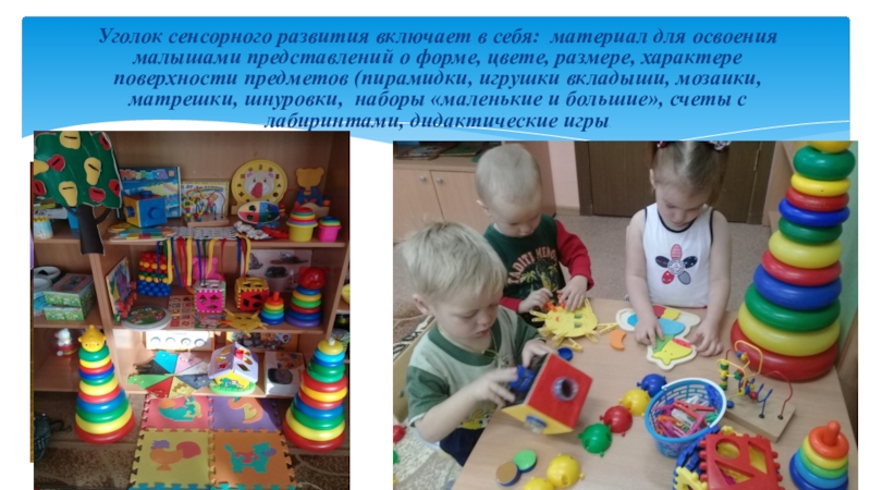 Слайд 11Уголок сенсорного развития включает в себя: материал для освоения малышами представлений