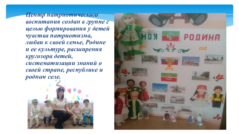 Слайд 27Центр патриотического воспитания создан в группе с целью формирования у детей