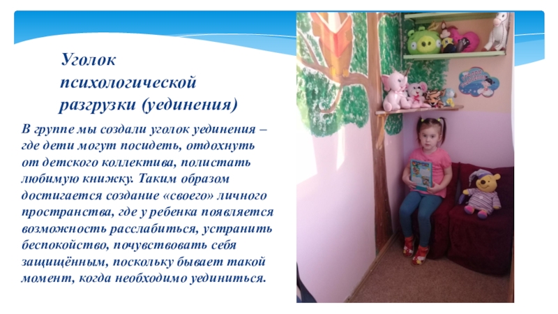 отдохнуть от детского коллектива, полистать любимую книжку. Таким образом достигается создание «своего» личного пространства, где у ребенка появляется возможность расслабиться, устранить беспокойство, почувствовать себя защищённым, поскольку бывает такой момент, когда необходимо уединиться.
