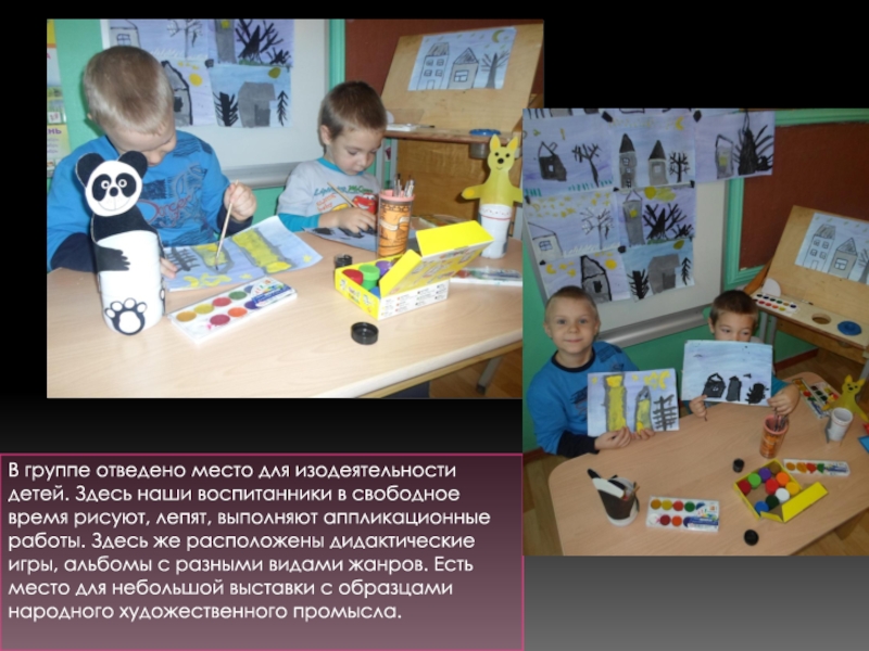 Слайд 22В группе отведено место для изодеятельности детей. Здесь наши воспитанники в