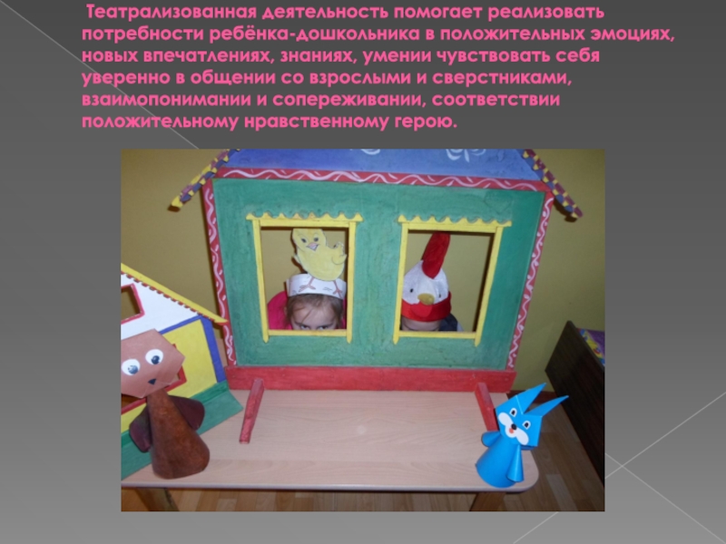 Слайд 30 Театрализованная деятельность помогает реализовать потребности ребёнка-дошкольника в положительных эмоциях, новых