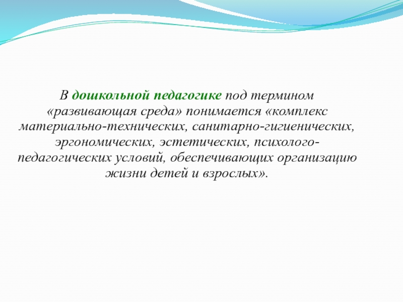 В дошкольной педагогике под термином «развивающая среда» понимается «комплекс материально-технических, санитарно-гигиенических, эргономических, эстетических, психолого-педагогических условий,