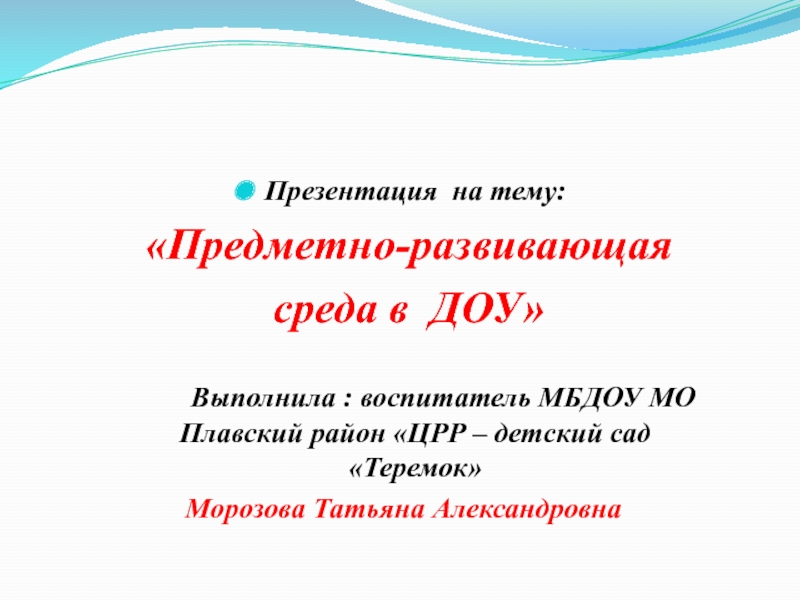 Презентация на тему: «Предметно-развивающая среда в ДОУ» Выполнила : воспитатель МБДОУ МО Плавский район «ЦРР – детский сад «Теремок»Морозова Татьяна Александровна