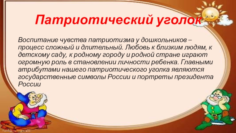 Патриотический уголокВоспитание чувства патриотизма у дошкольников – процесс сложный и длительный. Любовь к близким людям, к детскому