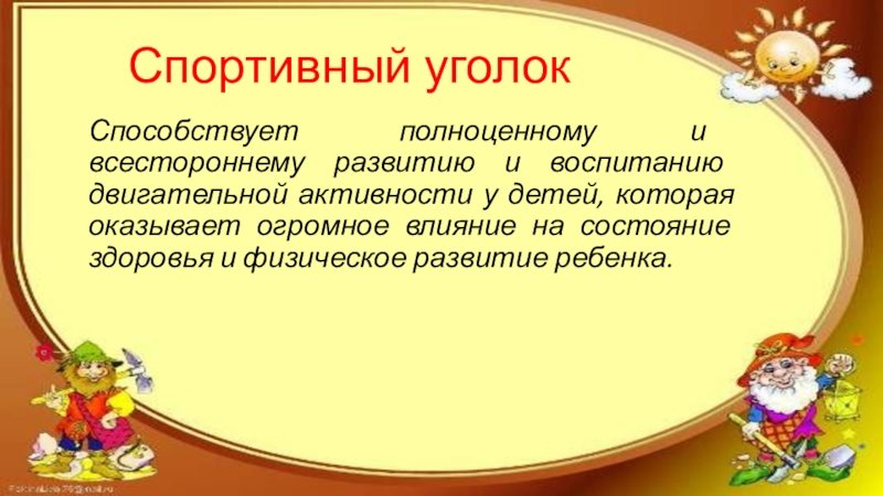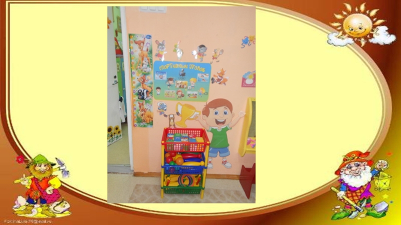 Спортивный уголокСпособствует  полноценному и всестороннему развитию и воспитанию   двигательной активности у детей, которая оказывает огромное влияние