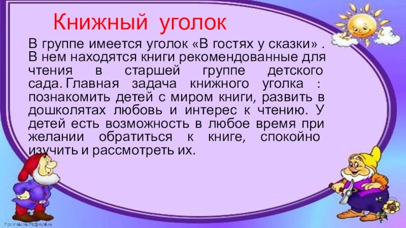 нем находятся книги рекомендованные для чтения в старшей группе детского сада. Главная задача книжного уголка : познакомить детей с миром книги, развить в дошколятах любовь и интерес к чтению. У детей есть возможность в любое время при желании обратиться к книге, спокойно изучить и рассмотреть их.