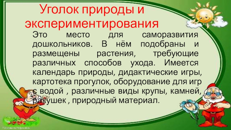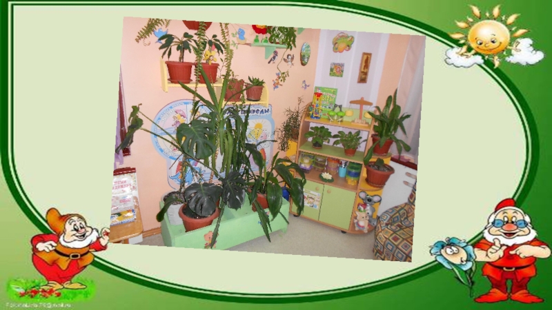 и размещены растения, требующие различных способов ухода. Имеется календарь природы, дидактические игры, картотека прогулок, оборудование для игр с водой , различные виды крупы, камней, ракушек , природный материал.