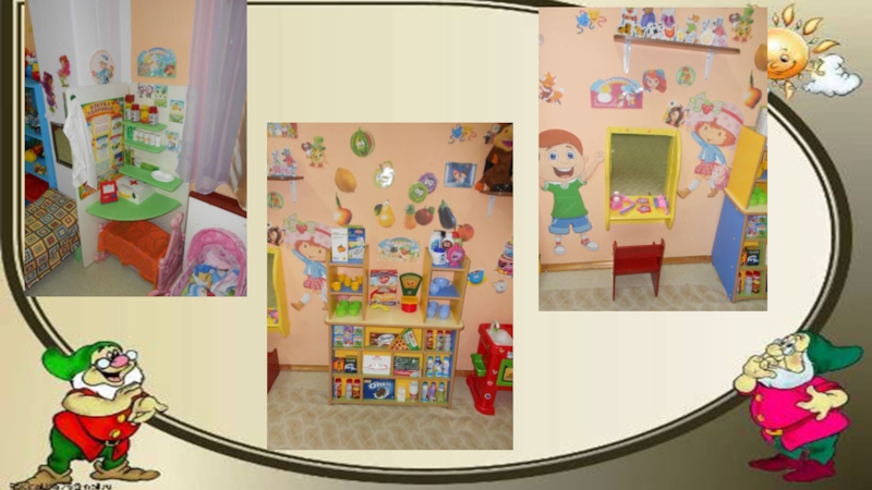 В группе также выделены зоны для сюжетно-ролевых игр -   «Больница», «Семья», «Парикмахерская», «Магазин». .
