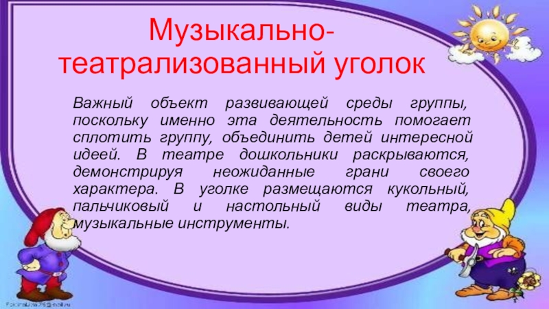 Музыкально-театрализованный уголокВажный объект развивающей среды группы, поскольку именно эта деятельность помогает сплотить группу, объединить детей интересной идеей.