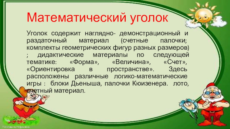 Математический уголокУголок содержит наглядно- демонстрационный и раздаточный материал (счетные палочки; комплекты геометрических фигур разных размеров) ; дидактические