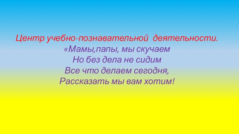 Центр учебно-познавательной деятельности.«Мамы,папы, мы скучаемНо без дела не сидимВсе что делаем сегодня,Рассказать мы вам хотим!