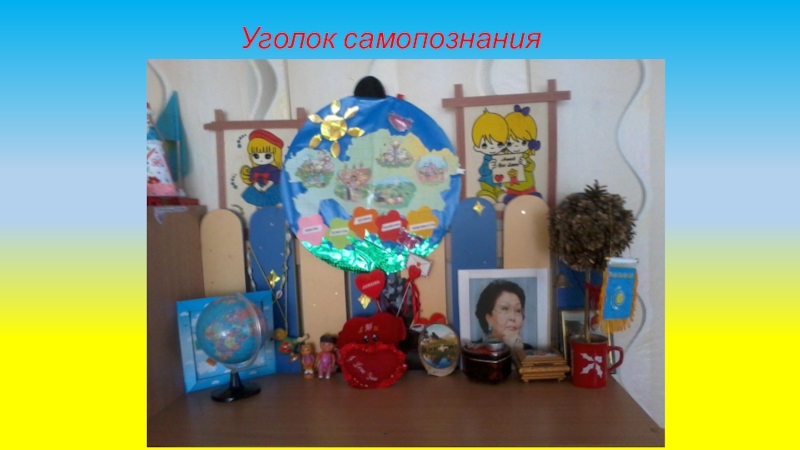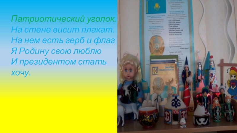 Патриотический уголок.На стене висит плакат.На нем есть герб и флагЯ Родину свою люблюИ президентом стать хочу.