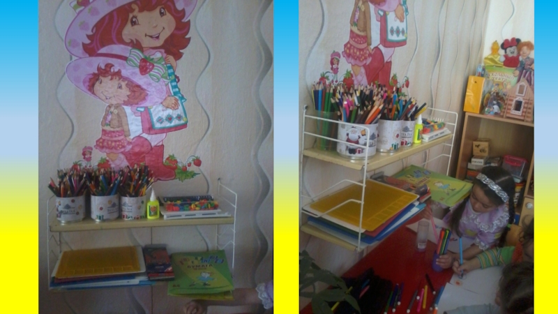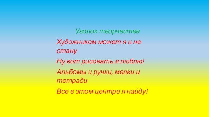 Уголок творчестваХудожником может я и не стануНу вот рисовать я люблю!Альбомы и ручки, мелки и тетрадиВсе в
