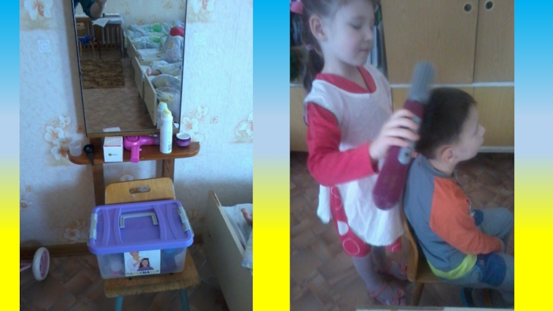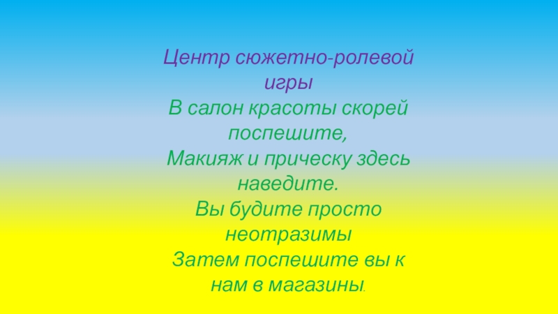 Центр сюжетно-ролевой игрыВ салон красоты скорей поспешите,Макияж и прическу здесь наведите.Вы будите просто неотразимыЗатем поспешите вы к