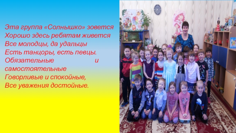 Эта группа «Солнышко» зоветсяХорошо здесь ребятам живетсяВсе молодцы, да удальцыЕсть танцоры, есть певцы.Обязательные и самостоятельныеГоворливые и спокойные,Все