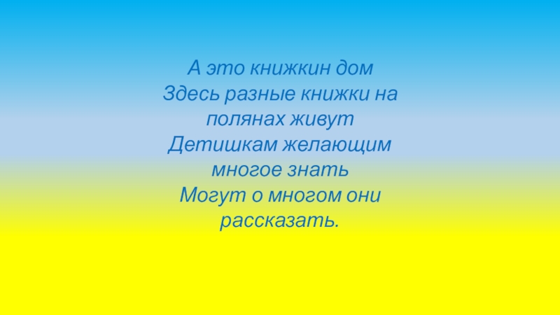 А это книжкин домЗдесь разные книжки на полянах живутДетишкам желающим многое знатьМогут о многом они рассказать.