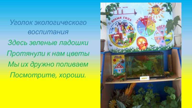 Уголок экологического воспитанияЗдесь зеленые ладошки Протянули к нам цветыМы их дружно поливаемПосмотрите, хороши.