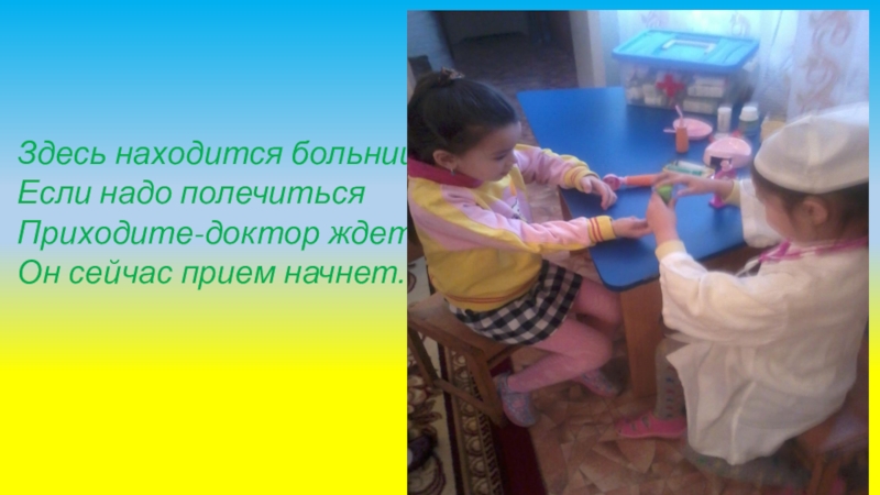 Здесь находится больницаЕсли надо полечитьсяПриходите-доктор ждетОн сейчас прием начнет.