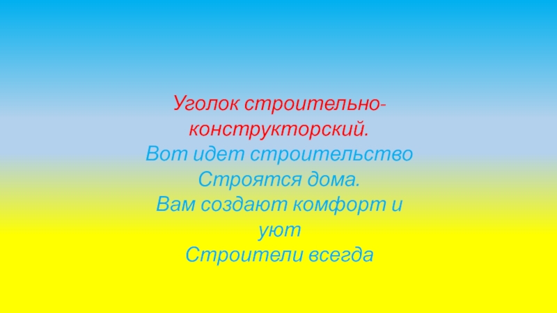 Уголок строительно- конструкторский.Вот идет строительствоСтроятся дома.Вам создают комфорт и уютСтроители всегда