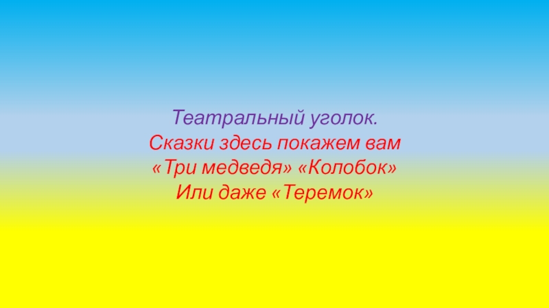 Театральный уголок.Сказки здесь покажем вам«Три медведя» «Колобок»Или даже «Теремок»