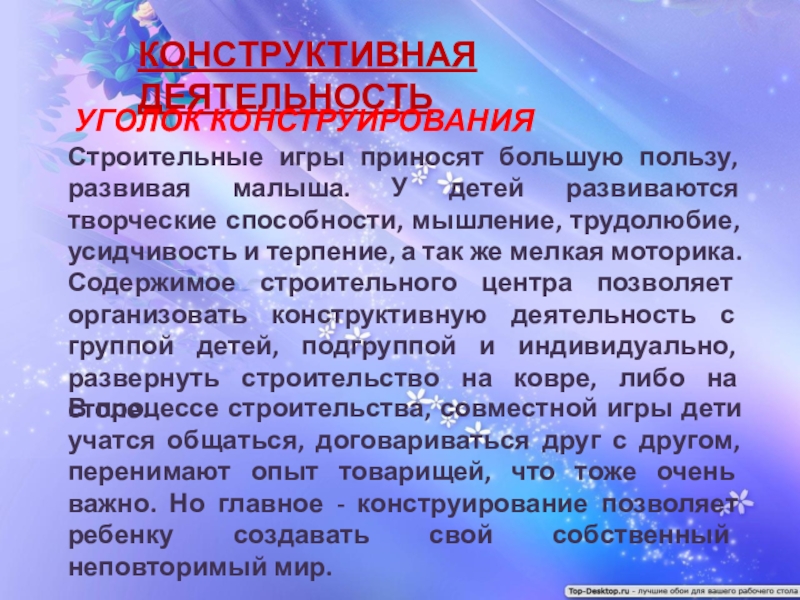 В процессе строительства, совместной игры дети учатся общаться, договариваться друг с другом, перенимают опыт товарищей, что тоже очень важно. Но главное - конструирование позволяет ребенку создавать свой собственный неповторимый мир.