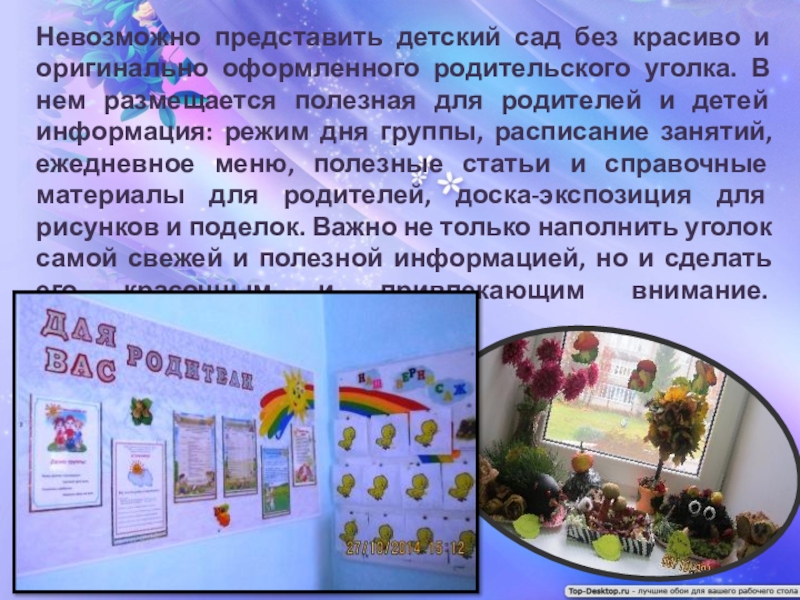 Слайд 7Невозможно представить детский сад без красиво и оригинально оформленного родительского уголка.