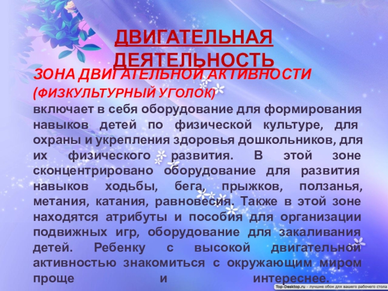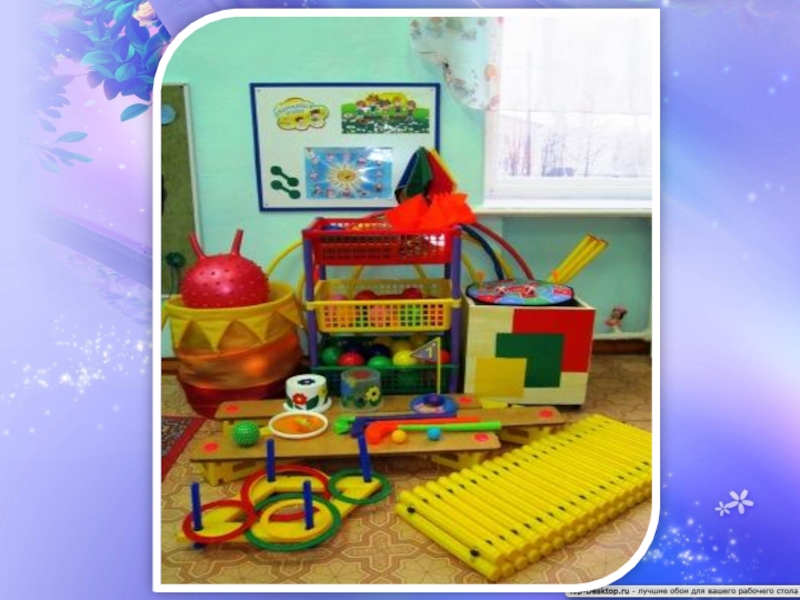 навыков детей по физической культуре, для охраны и укрепления здоровья дошкольников, для их физического развития. В этой зоне сконцентрировано оборудование для развития навыков ходьбы, бега, прыжков, ползанья, метания, катания, равновесия. Также в этой зоне находятся атрибуты и пособия для организации подвижных игр, оборудование для закаливания детей. Ребенку с высокой двигательной активностью знакомиться с окружающим миром проще и интереснее.