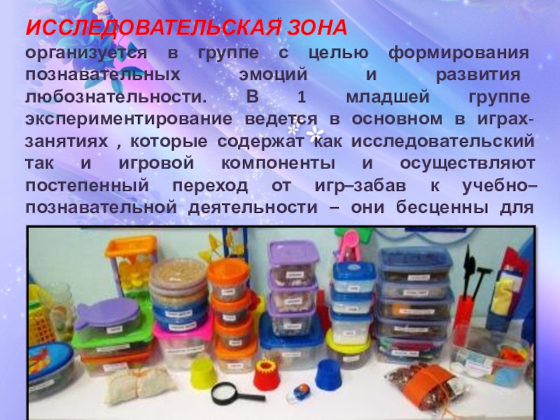 развития любознательности. В 1 младшей группе экспериментирование ведется в основном в играх- занятиях , которые содержат как исследовательский так и игровой компоненты и осуществляют постепенный переход от игр–забав к учебно–познавательной деятельности – они бесценны для развития такого замечательного качества как наблюдательность .