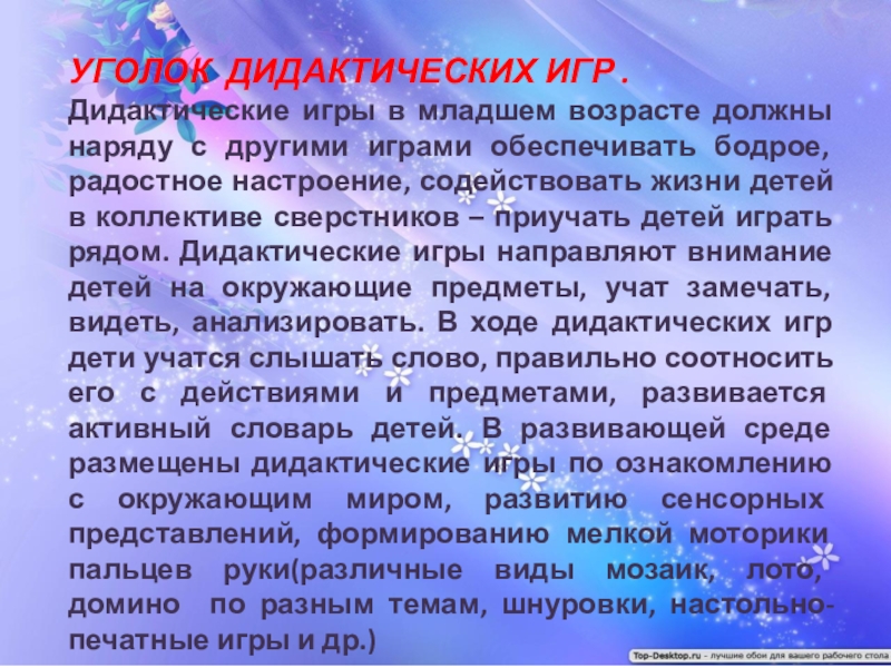другими играми обеспечивать бодрое, радостное настроение, содействовать жизни детей в коллективе сверстников – приучать детей играть рядом. Дидактические игры направляют внимание детей на окружающие предметы, учат замечать, видеть, анализировать. В ходе дидактических игр дети учатся слышать слово, правильно соотносить его с действиями и предметами, развивается активный словарь детей. В развивающей среде размещены дидактические игры по ознакомлению с окружающим миром, развитию сенсорных представлений, формированию мелкой моторики пальцев руки(различные виды мозаик, лото, домино по разным темам, шнуровки, настольно-печатные игры и др.)