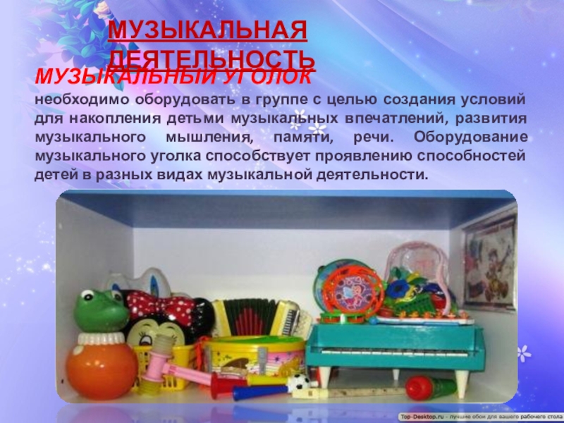 накопления детьми музыкальных впечатлений, развития музыкального мышления, памяти, речи. Оборудование музыкального уголка способствует проявлению способностей детей в разных видах музыкальной деятельности.