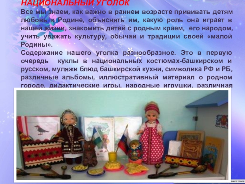 Содержание нашего уголка разнообразное. Это в первую очередь куклы в национальных костюмах-башкирском и русском, муляжи блюд башкирской кухни, символика РФ и РБ, различные альбомы, иллюстративный материал о родном городе, дидактические игры, народные игрушки, различная художественная литература.