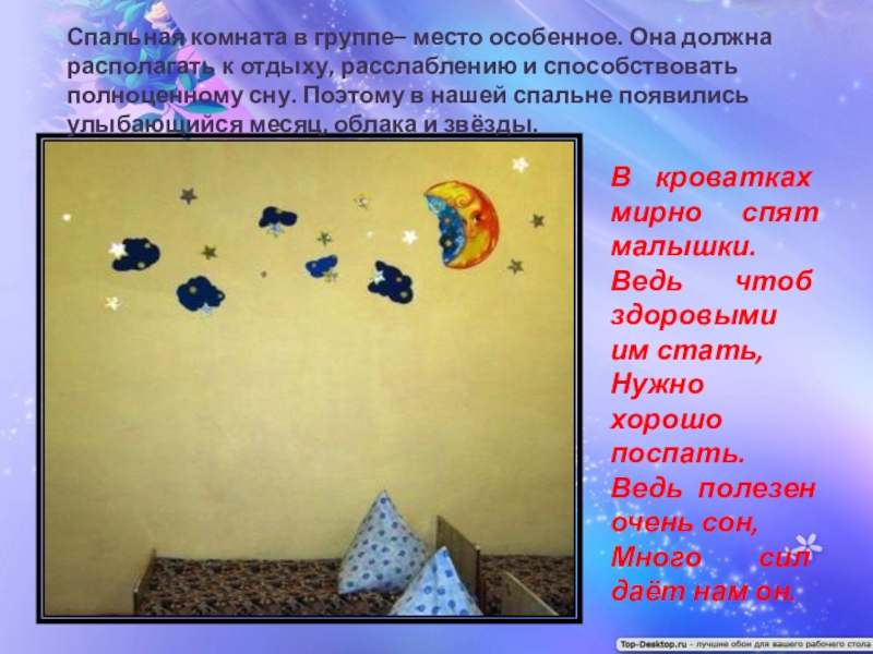 Слайд 36Спальная комната в группе– место особенное. Она должна располагать к отдыху,