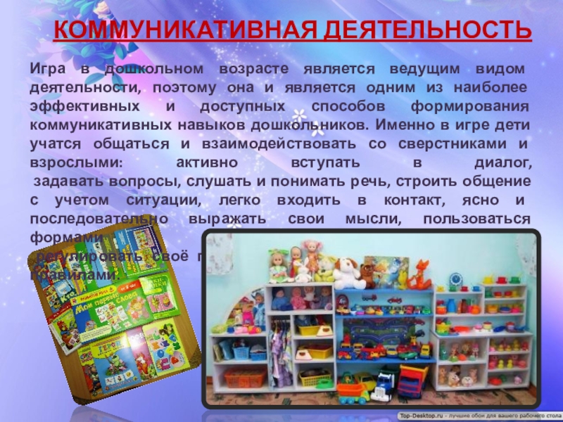 и является одним из наиболее эффективных и доступных способов формирования коммуникативных навыков дошкольников. Именно в игре дети учатся общаться и взаимодействовать со сверстниками и взрослыми: активно вступать в диалог,