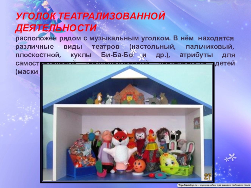 Слайд 31УГОЛОК ТЕАТРАЛИЗОВАННОЙ ДЕЯТЕЛЬНОСТИ